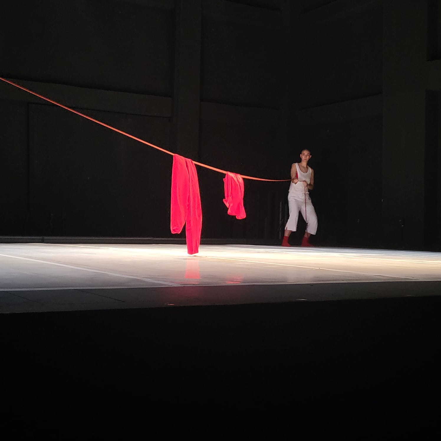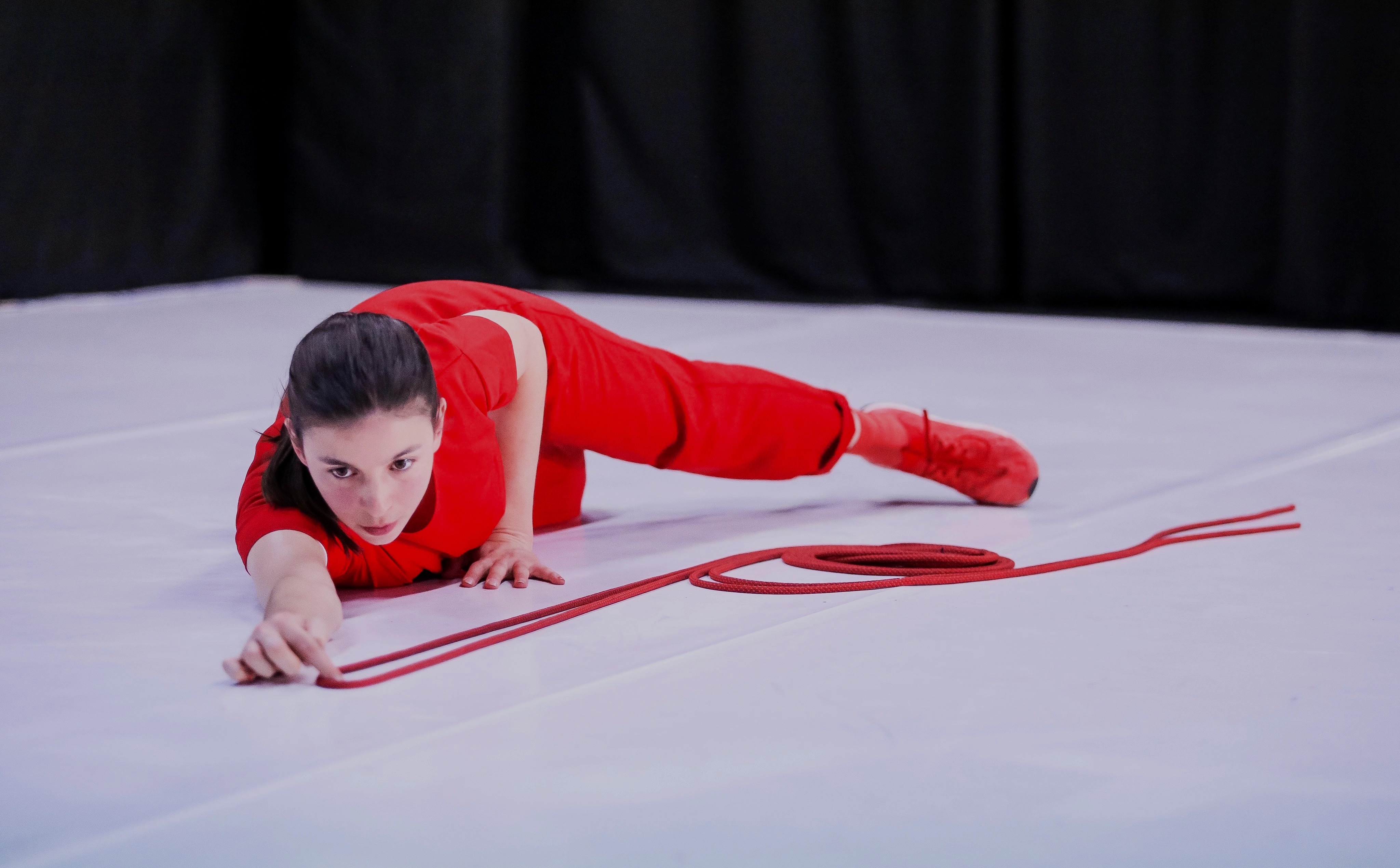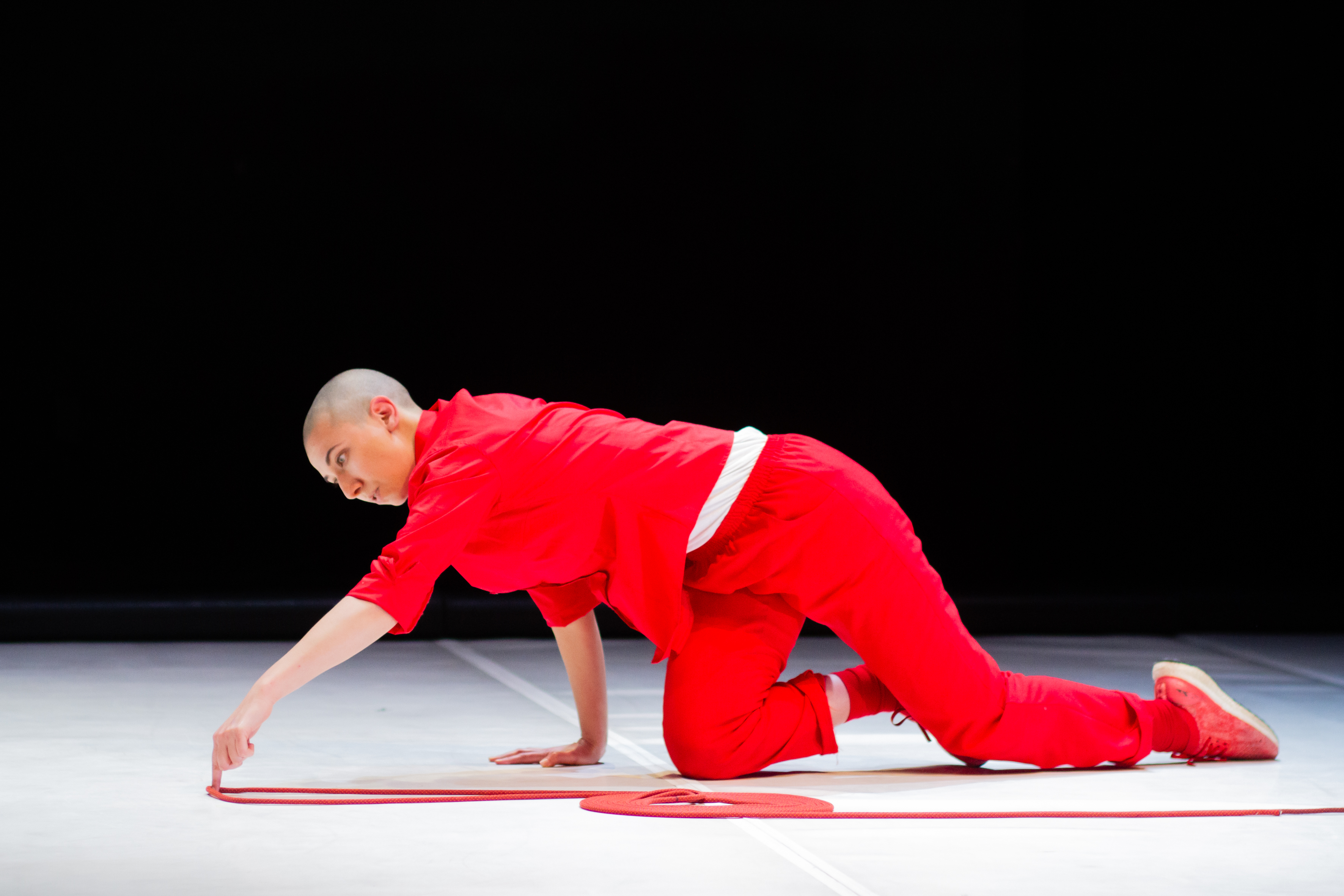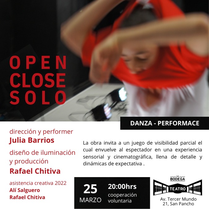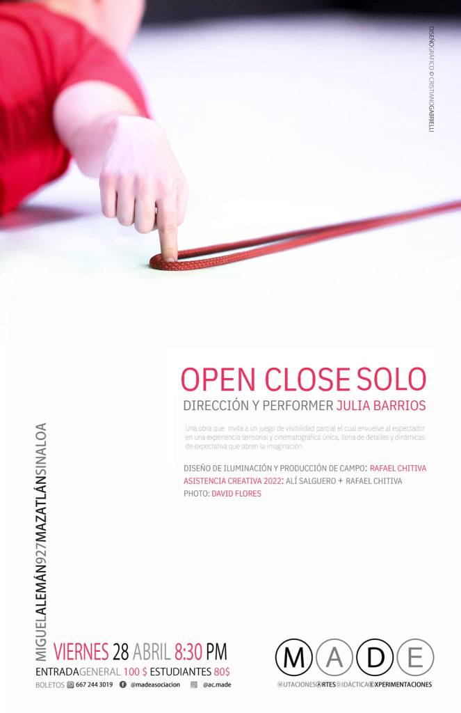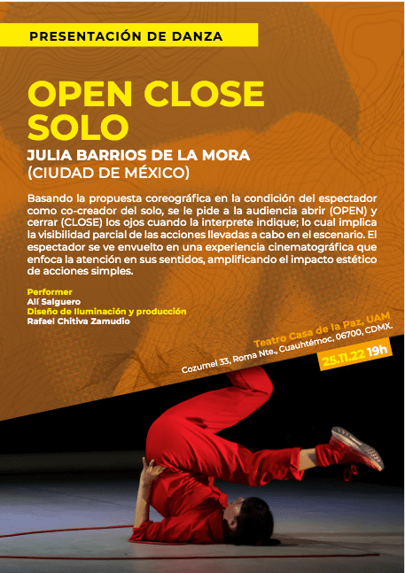 This piece plays with the possible relationships between light, sound, movement and objects in a choreographic form. It proposes a dynamic journey where the audience’s perception plays an important role to achieve these different possible relations. Throughout the performance, the audience is asked to be the “light technicians” of the solo by closing and opening their eyes every time that the performer says out loud: “CLOSE” and “OPEN”.
